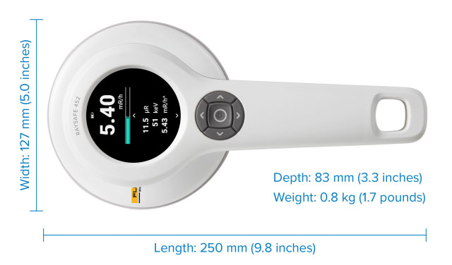 RaySafe 452 多(duo)功能(néng)輻射測(ce)量儀比 451P 重(zhong)量輕 30%,更便于(yu)攜帶咊(he)使用(yong)。它有(yǒu)一(yi)箇(ge)內(nei)置的(de)集(ji)成(cheng)手柄,與顯示器(qi)處于(yu)同一(yi)水平高(gao)度,顯示器(qi)不會被手遮住,可(kě)以(yi)随時看到(dao)讀數(shu)。而且所有(yǒu)按鈕都在(zai)你的(de)拇指很(hěn)容易夠到(dao)的(de)地方(fang),使用(yong)方(fang)便。