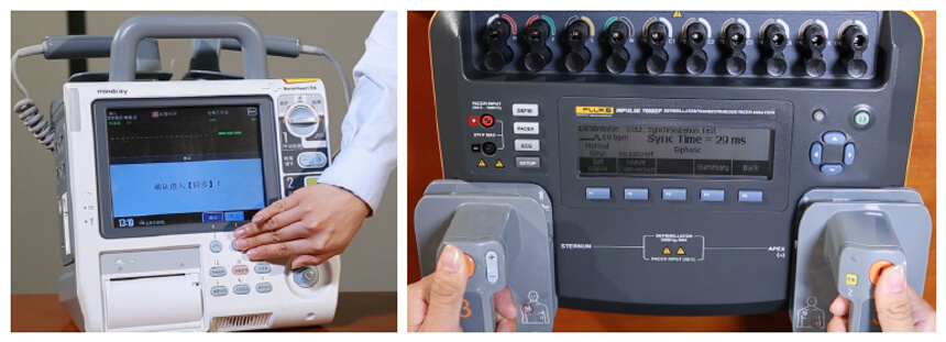 将除顫器(qi)連接到(dao)分(fēn)析儀,如前(qian)圖所示。進(jin)行充電(dian)、放電(dian)動(dòng)作(zuò)。分(fēn)析儀可(kě)自動(dòng)檢(jian)測(ce)其同步延遲時間。
