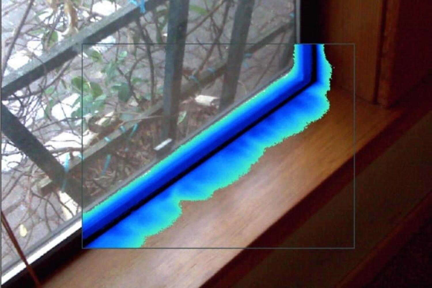 Cold air seeping through a leak will cool the areas around it, and hot air can warm the areas around it as well. In this case, the cool air leaking in through the window is visible with a thermal imager. Thermal imaging can also be used to identify heat escaping from a structure.