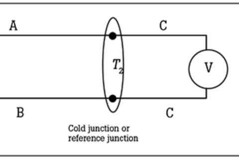 A voltage (thermoelectric force) is generated between the cold junction wires (T2) when the hot junction (T1) is exposed to a temperature that is different than the cold junction. An instrument connected to lead wires from the cold junction is used to read the thermocouple voltage.